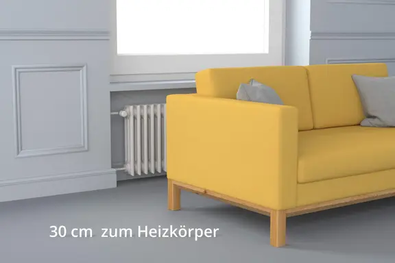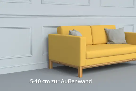 Soll das Sofa trotzdem an der Außenwand platziert werden, achten Sie auf ausreichend Abstand zwischen Möbel und Wand (etwa 5 cm bis 10 cm).