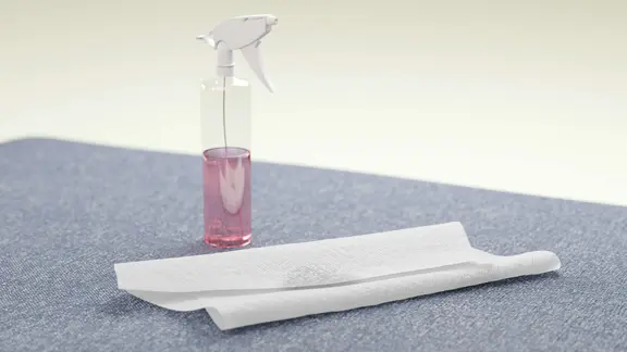 Bevor Sie mit der Reinigung beginnen, entstauben Sie die Fläche und prüfen Sie die Farbechtheit. Reiben Sie dafür mit einem weißen, weichen und mit Reinigungsmittel getränkten Tuch an einer verdeckten Stelle. Sind auch im trockenen Zustand keine Abfärbungen zu sehen, können Sie mit der Reinigung beginnen. Nehmen Sie den Fleck vom Rand zur Mitte hin mit dem Tuch auf. So verhindern Sie, dass sich der Fleck vergrößert. Denken Sie daran, das Möbel erst nach dem vollständigen Trocknen wieder zu benutzen.